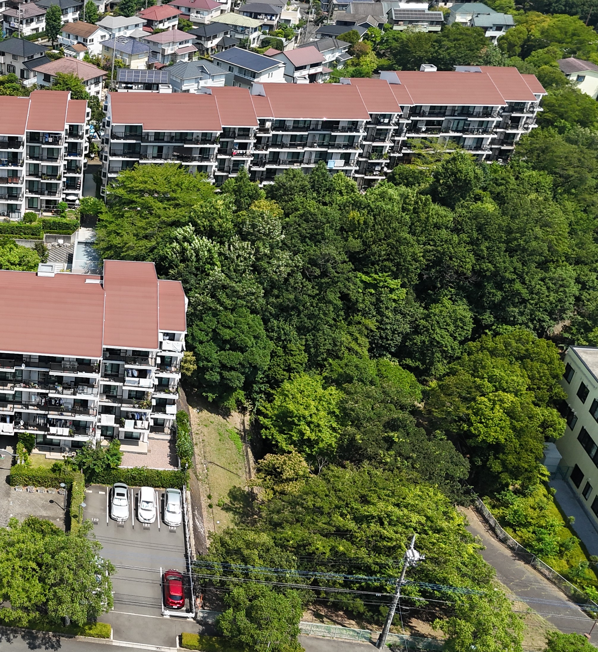 管理組合では、緑を豊にするという政策に沿い、厚木市より保護指定された(指定番号:338)マンション敷地内の樹林面積2,497㎡の樹木の管理を行っています。また、神奈川県森林協会の支援で、老高木伐採後に苗木植林しております。これらの事業に対し補助金・支援金を受けています。